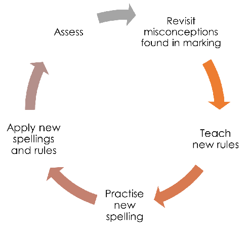 Staff supplement the words from the Twinkl sequence with ‘gaps’ that have been identified through previous summative assessments and common errors identified through daily marking of written work. A sample of three misspelt spellings are corrected in written work during marking and corrected by the child either independently (KS2) or with adults support (KS1). Common misconceptions identified will be the subject of self-correction in written work.
